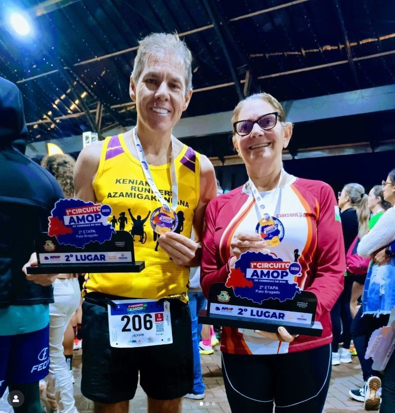"Quanta alegria amiga corredora Neiva Grosbelli, de poder registrar este momento na noite de ontem, no 1° Circuito AMOP de Corridas de Rua, em Pato Bragado. Faço questão de postar aqui, outras conquistas desta mulher que, aos 68 anos, está sempre em busca do seu bem estar e inspirando gerações inteiras à praticar esporte e cuidar da saúde. Ela é corredora da Associação Chasques de Santa Helena, grupo pelo qual corri por tantos anos". Escreveu Jackson Bueno, em seu perfil do Instagram - @jackson.ultramaratonista