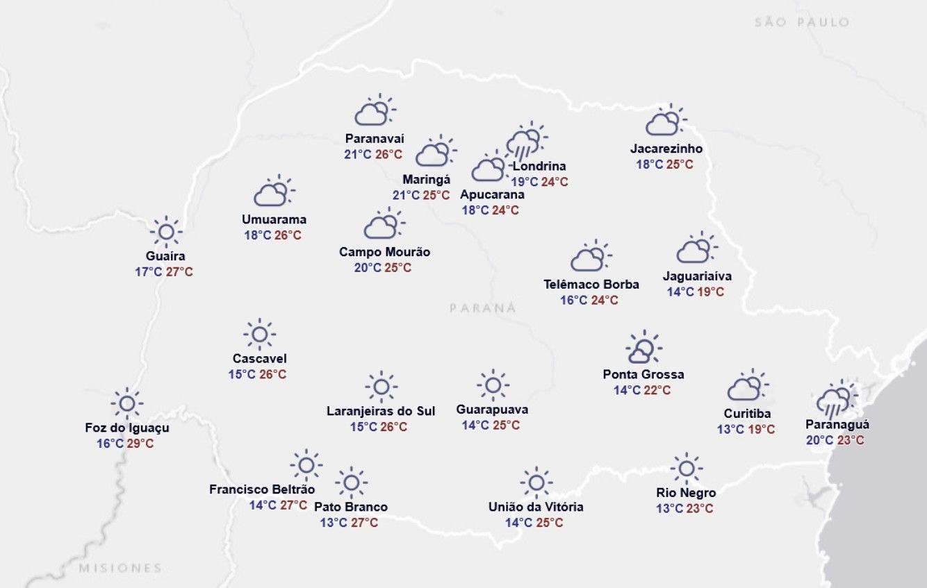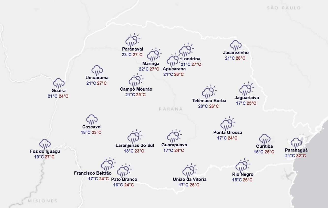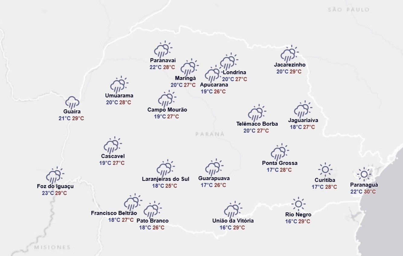 A partir da tarde, as chuvas tendem a ocorrer de forma pontual e rápida também nos Campos Gerais e no Leste do estado. Com o escoamento dos ventos de norte, as temperaturas podem ultrapassar os 30°C em diversas regiões do Paraná. A mínima prevista no estado é de 19°C, na região Sul, enquanto a máxima pode chegar a 32°C no Noroeste.
