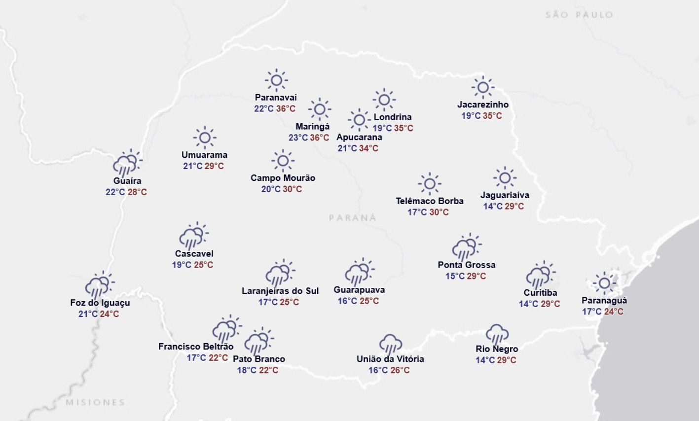 Veja, abaixo, a previsão do tempo para o Paraná: