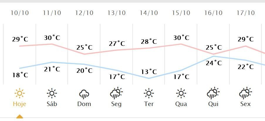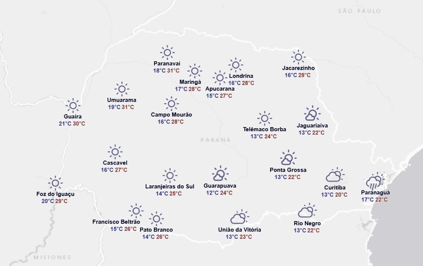 Por conta da nebulosidade, as temperaturas seguem amenas entre a Capital, o Litoral e a região de Ponta Grossa, que não terão máximas acima de 20°C. Já no Interior, com predomínio de sol no Noroeste, Oeste e Sudoeste, as temperaturas chegam a 26°C.