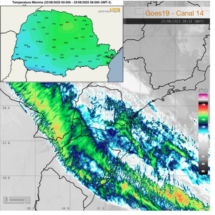 “As condições do tempo seguem sendo influenciadas pela presença de uma frente fria sobre o oceano na altura do Sul do país e também com um fluxo de umidade vindo do Norte brasileiro, que chega ao Paraná pelas regiões Oeste e Noroeste do estado. A partir de quarta-feira, essa frente fria se afasta para o oceano e a instabilidade diminui em todas as regiões do Estado”, explica Paulo Barbieri, meteorologista do Simepar.