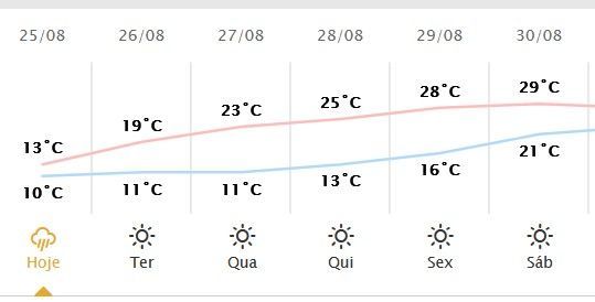 As temperaturas máximas terão variação: entre terça (26) e quarta (27) não passam de 16°C na metade Sul do estado (incluindo o Litoral), e a partir de quarta-feira os termômetros podem ultrapassar os 30°C no Norte, e ficam entre 25°C e 27°C no Oeste e Sudoeste.