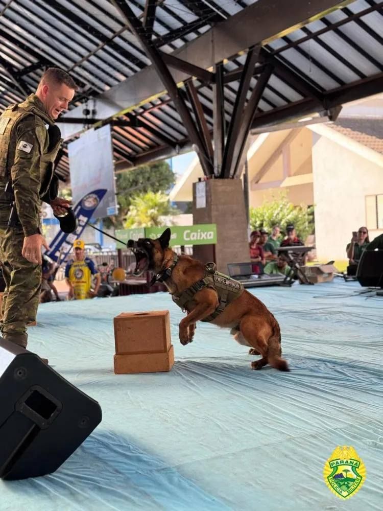 Um dos destaques foi uma demonstração do cão Ollie, que realizou buscas simuladas por entorpecentes, exibindo sua capacidade de identificação de odores ilícitos. Ao localizar o material indicado, o animal recebe uma recompensa, procedimento utilizado como reforço de treinamento e incentivo de desempenho — técnica aplicada no emprego de cães em ações policiais.