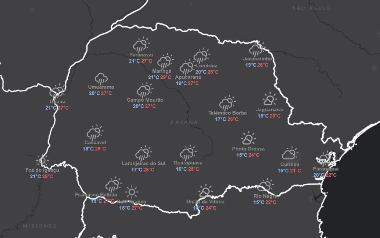 Veja, abaixo, a previsão do tempo para o Paraná divulgada pelo Simepar.