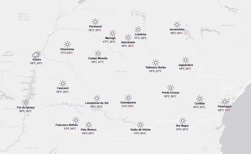 Para quinta-feira (9), o Simepar afirma que não há previsão de chuva em praticamente todo o Paraná.