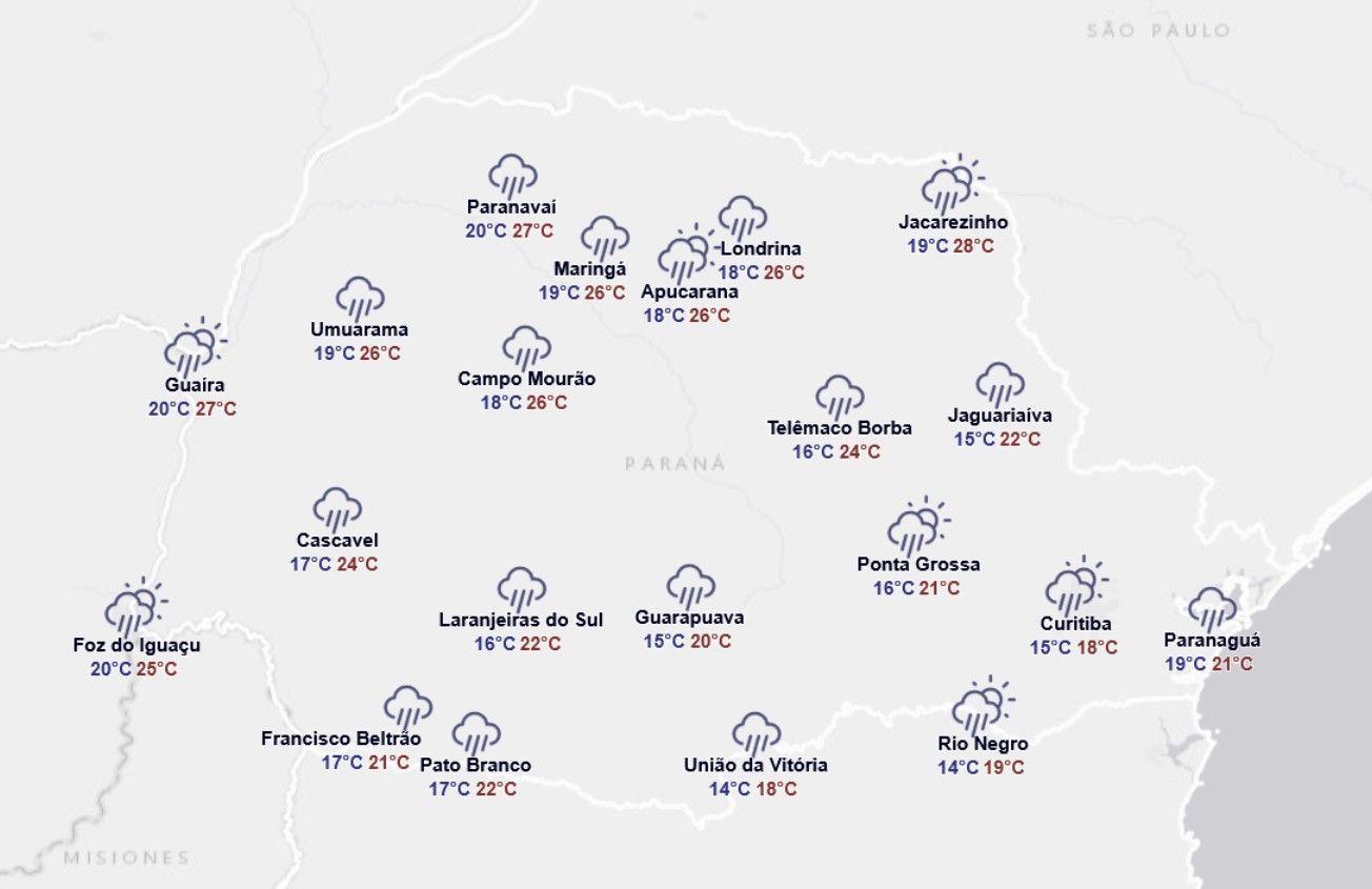 Na quinta e na sexta-feira (31), a chuva diminui, e ocorre de forma isolada. As temperaturas ficam um pouco mais baixas no Centro-Sul, nos Campos Gerais e na RMC, com mínimas entre 10°C e 12°C.