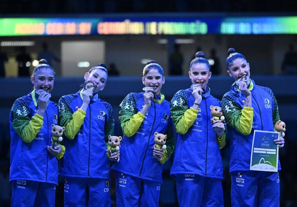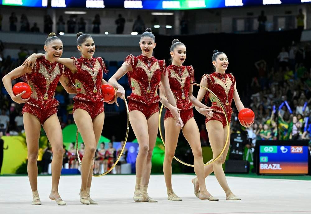 O time brasileiro, que pela primeira vez subiu ao pódio em um Mundial de Ginástica Rítmica, também conta com as ginastas Maria Eduarda Arakaki, Maria Paula Caminha e Sofia Pereira.