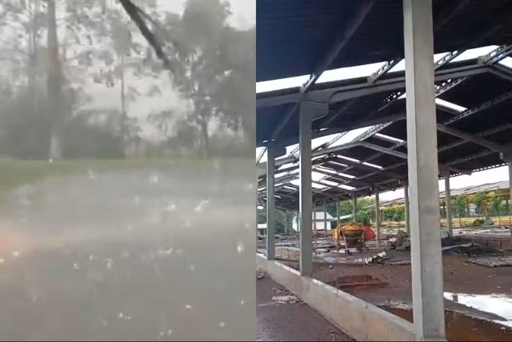 Além disso, o telhado de zinco da construção foi arrancado, e parte das chapas metálicas acabou caindo sobre maquinários agrícolas, que também sofreram avarias. (Veja vídeo acima).