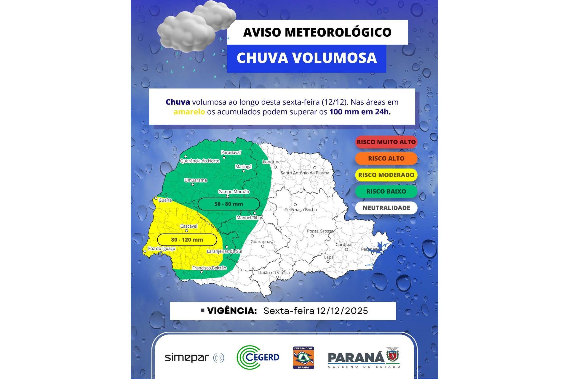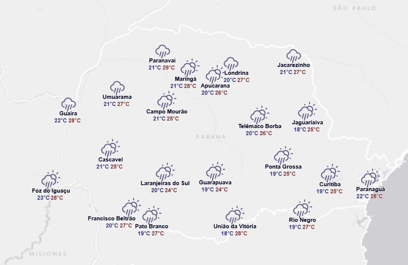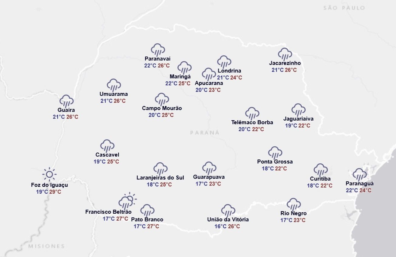 De acordo com o Sistema de Tecnologia e Monitoramento Ambiental do Paraná (Simepar), nesta sexta-feira (12) o tempo instável predomina em todo o Paraná, com chuvas e temporais, se destacando as faixas oeste, centro e norte.