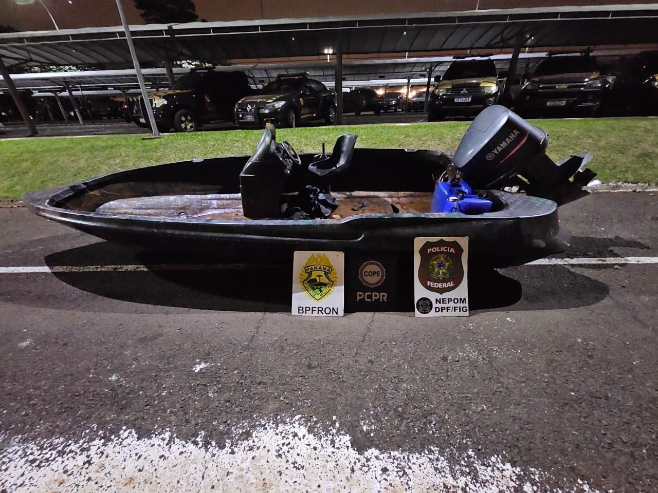 Na quarta-feira (16/07), a Polícia Militar do Paraná por meio do Batalhão de Polícia de Fronteira (BPFRON), Polícia Federal/NEPOM e a Polícia Civil/COPE, no âmbito da Operação Protetor de Divisas e Fronteiras, durante patrulhamento na região de Santa Helena – PR, em ação embarcada da Polícia Federal, avistou indivíduos que se aproximavam pelo lado paraguaio e empreenderam fuga ao perceberem a presença policial, abandonando uma embarcação.