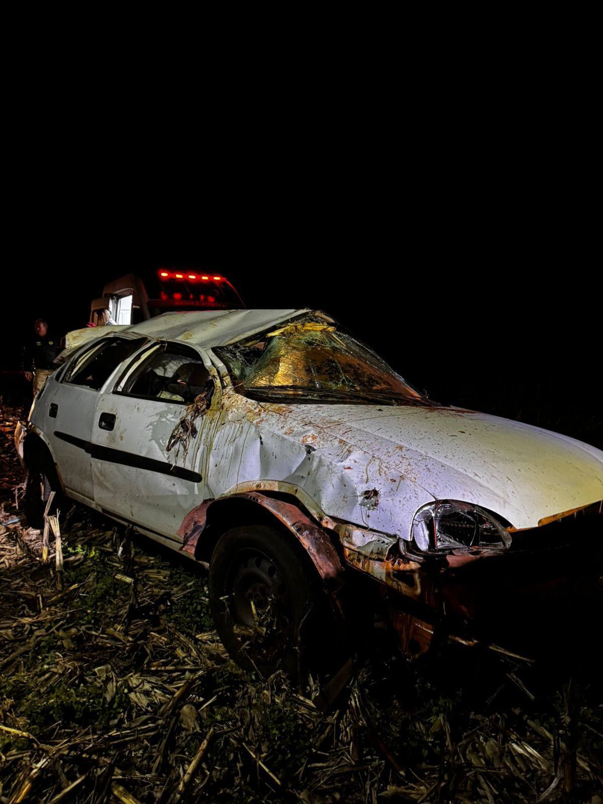 Motorista foge da polícia, capota carro em lavoura e é socorrido com ferimentos