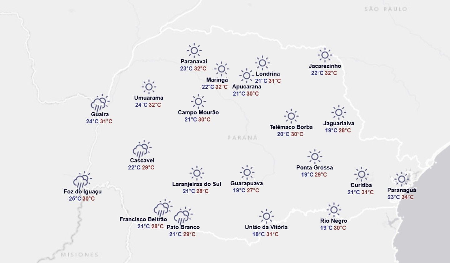 Nesta segunda-feira (22), o calor persiste em todo o Paraná, com temperaturas máximas que superam os 30 °C em praticamente todas as regiões, atingindo cerca de 36 °C em municípios do Noroeste. No período da tarde, pancadas de chuva isoladas, típicas de verão, ocorrem de maneira irregular pelo estado, com potencial para forte intensidade e acompanhadas de elevada incidência de raios, especialmente no Noroeste, Oeste, Sudoeste e Sul, em municípios próximos à fronteira com o Paraguai e a Argentina e à divisa com o MS e SC.