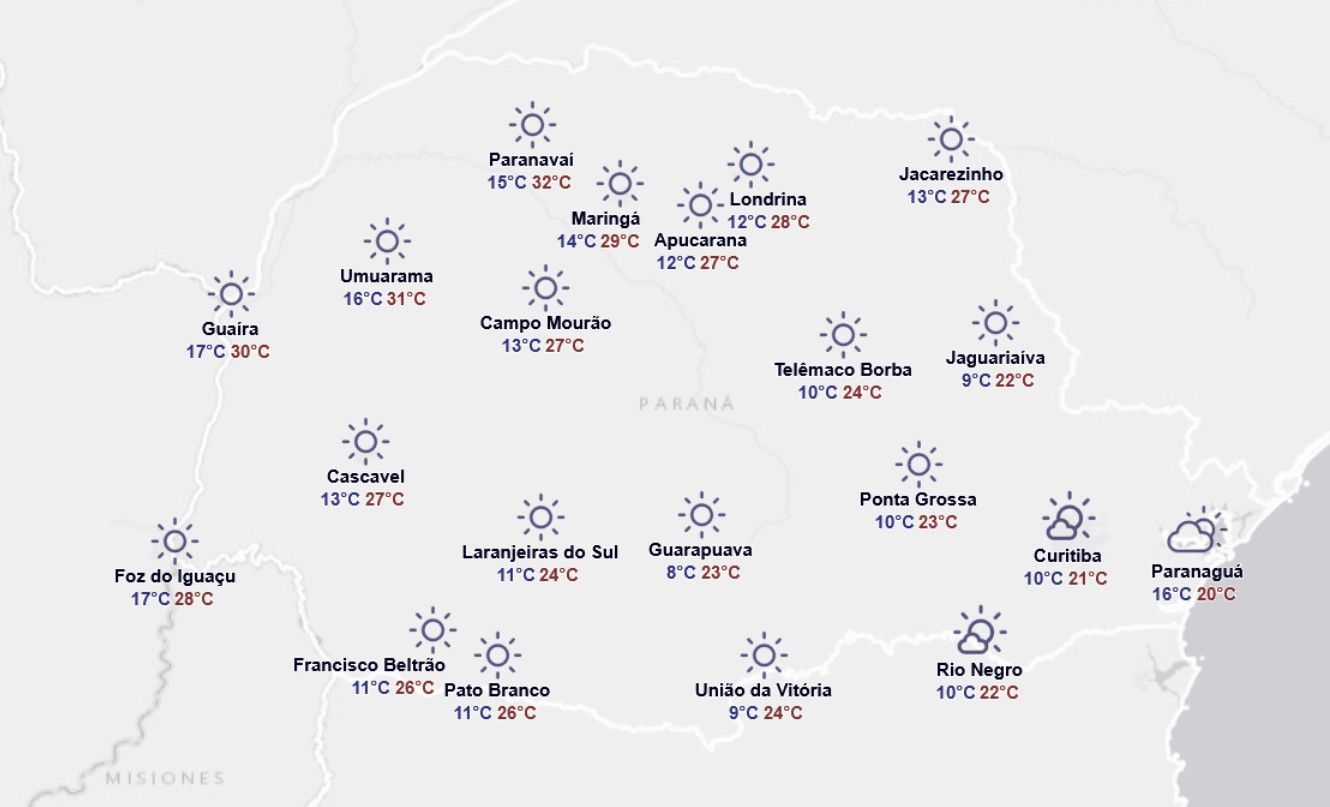 O amanhecer deste sábado segue com temperaturas baixas no Paraná, mas esquenta na maior parte das regiões. Uma nova frente fria avança pelo Sul do Brasil durante o fim de semana, com retorno das chuvas no Oeste e Sudoeste paranaense na noite deste sábado.