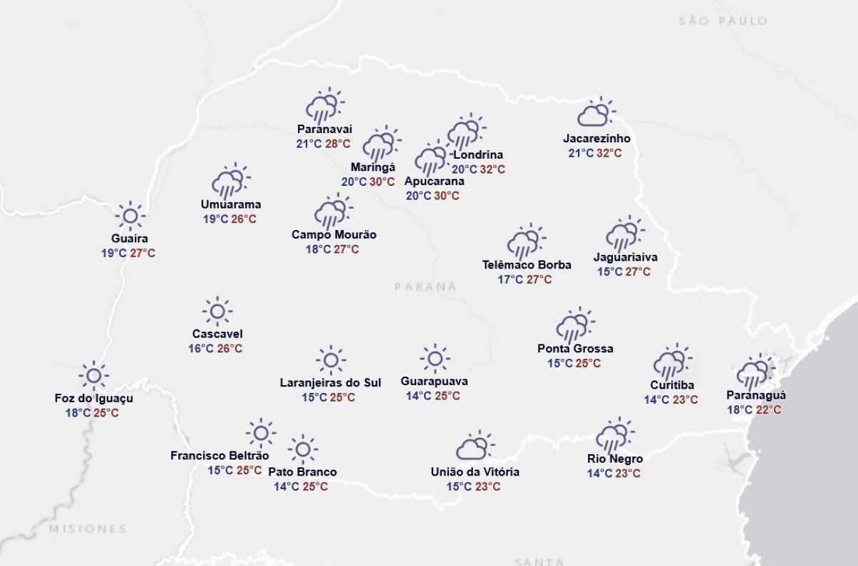 Veja, abaixo, a previsão do tempo para o Paraná: