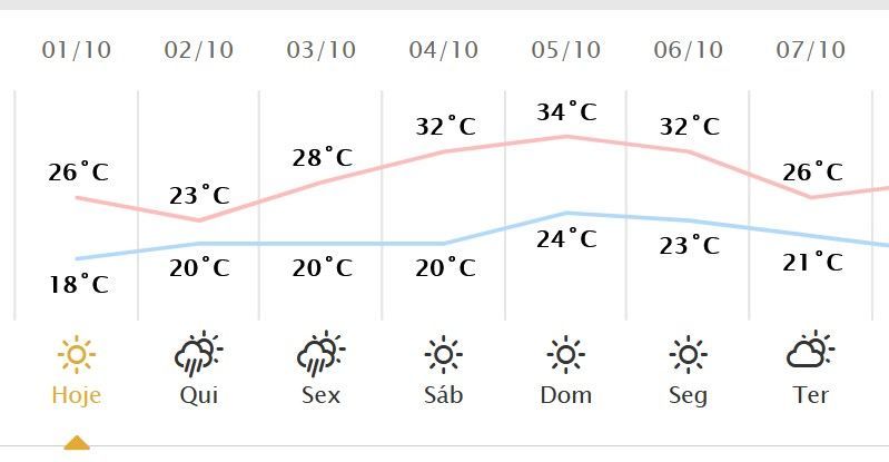 Entre uma frente fria e outra, o tempo fica estável, com sol entre nuvens e temperaturas mais altas. No Norte, Noroeste e Oeste as temperaturas máximas poderão ultrapassar 34°C e a umidade relativa do ar ficará mais baixa, em torno de 25% a 50% no período da tarde.