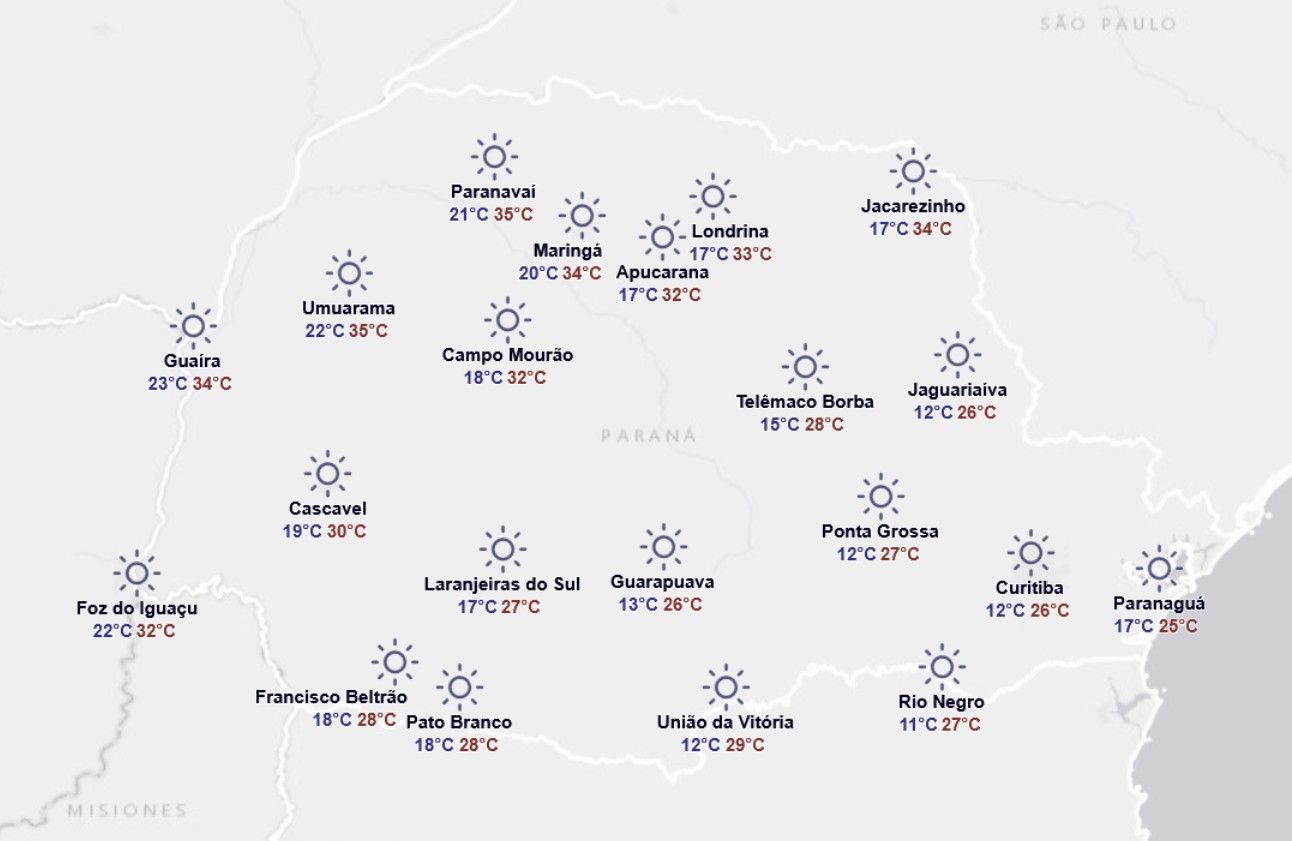 Segundo o Simepar (Sistema de Tecnologia e Monitoramento Ambiental do Paraná), o amanhecer de sábado (25), apresentou nuvens baixas, especialmente na região Leste, entre Curitiba e o litoral, que se dissiparam rapidamente. Durante o dia, a nebulosidade alta predominará em todo o estado.