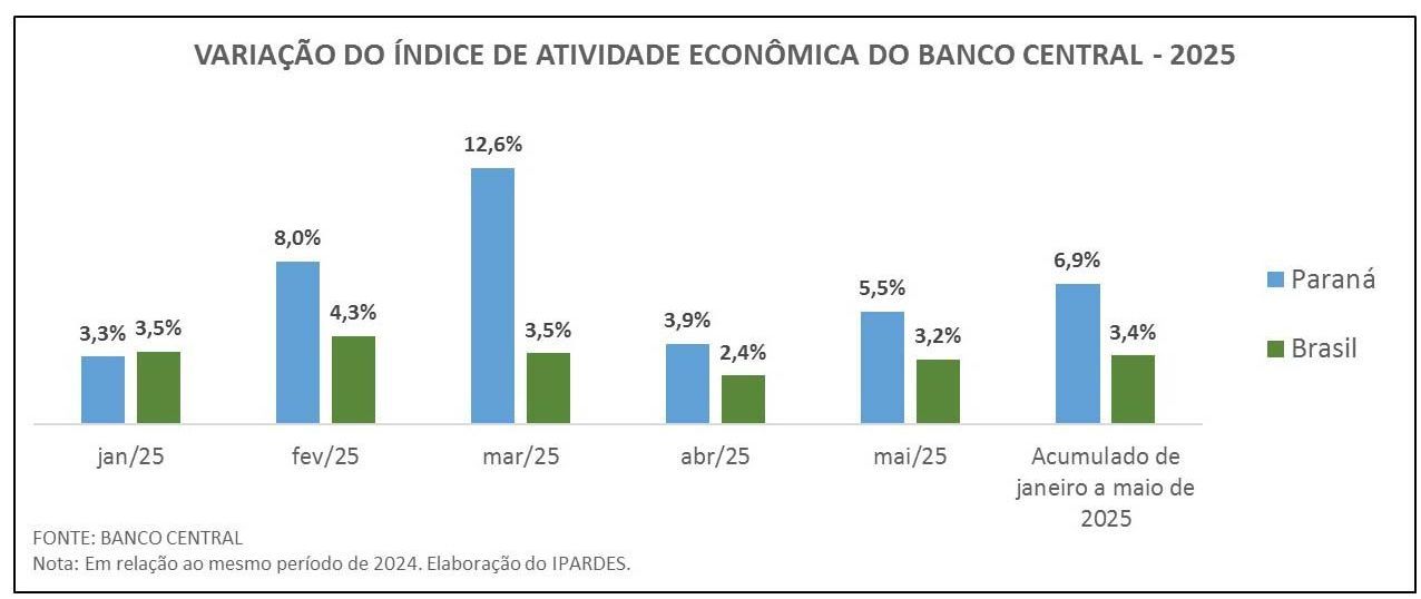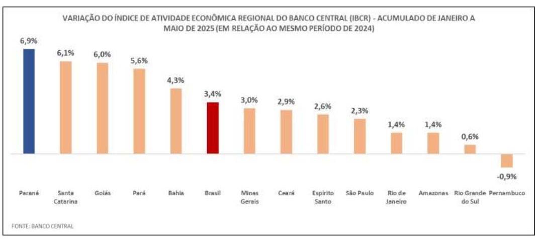 O Paraná registrou o maior crescimento da atividade econômica do Brasil nos primeiros cinco meses de 2025, com 6,9%, segundo dados do Banco Central. É o dobro do mesmo resultado nacional no período, que foi de 3,4% (diferença de 3,5 pontos percentuais). O comparativo é com o mesmo período do ano anterior. Os dados foram reunidos pelo Instituto Paranaense de Desenvolvimento Econômico e Social (Ipardes).