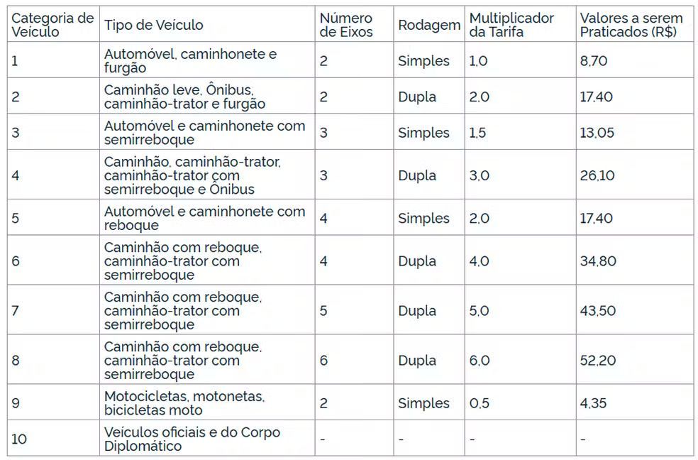 Confira na tabela abaixo a taxa de pedágio por categoria de veículo.