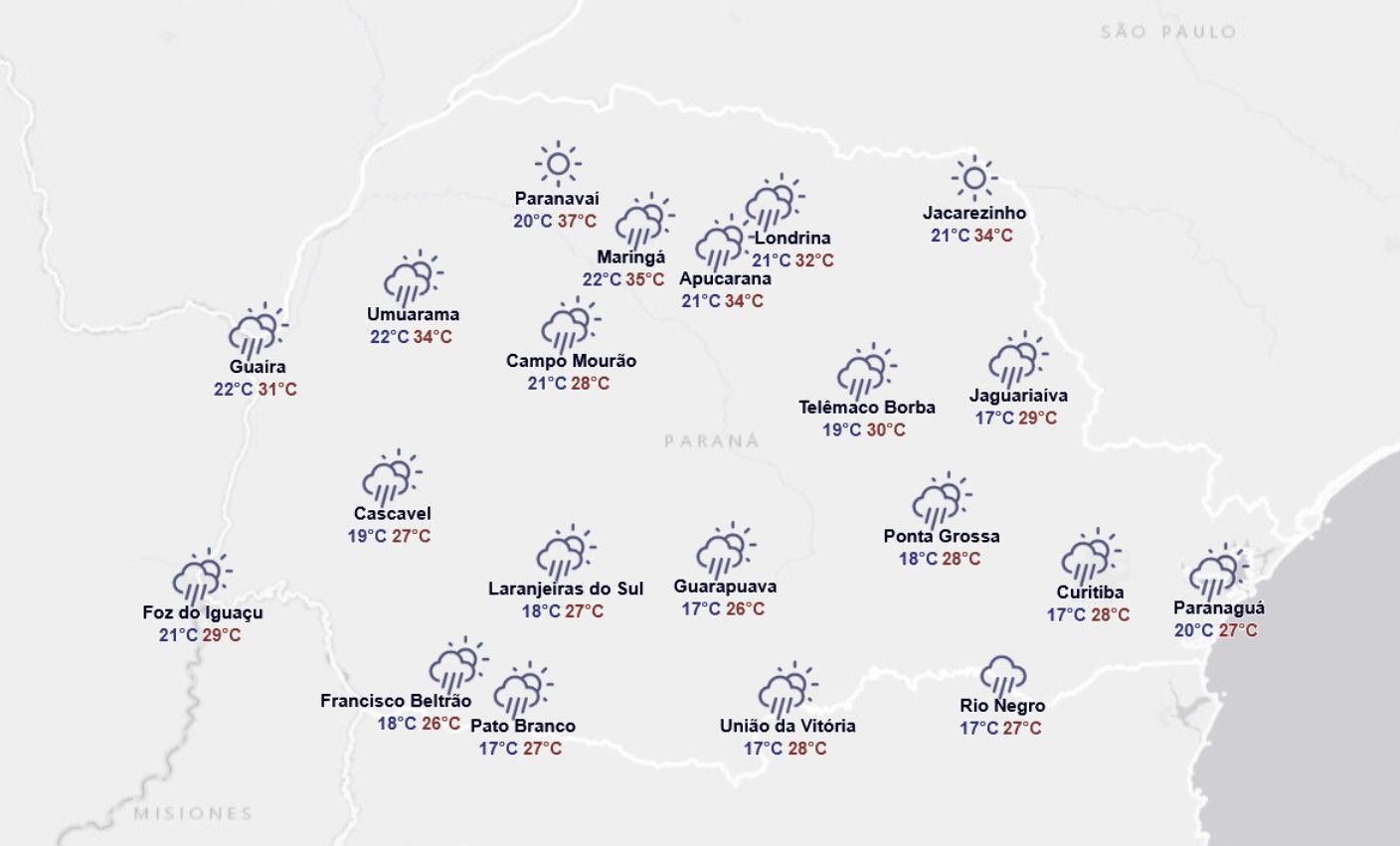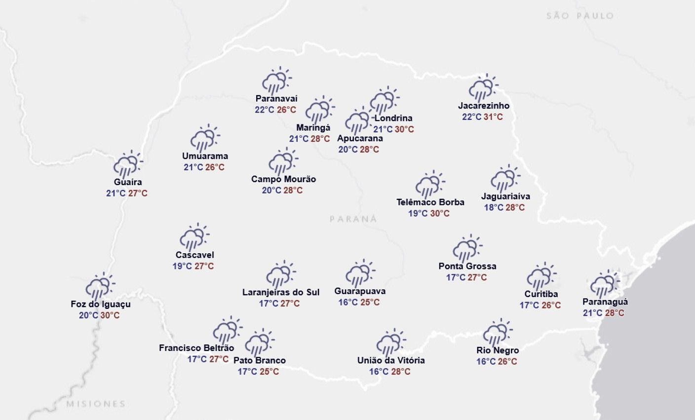 O Sistema de Tecnologia e Monitoramento Ambiental do Paraná (Simepar) prevê que, após chuvas que começaram já no domingo em algumas regiões, o tempo volte gradativamente a ficar estável em todo o Estado a partir de quarta-feira (3).