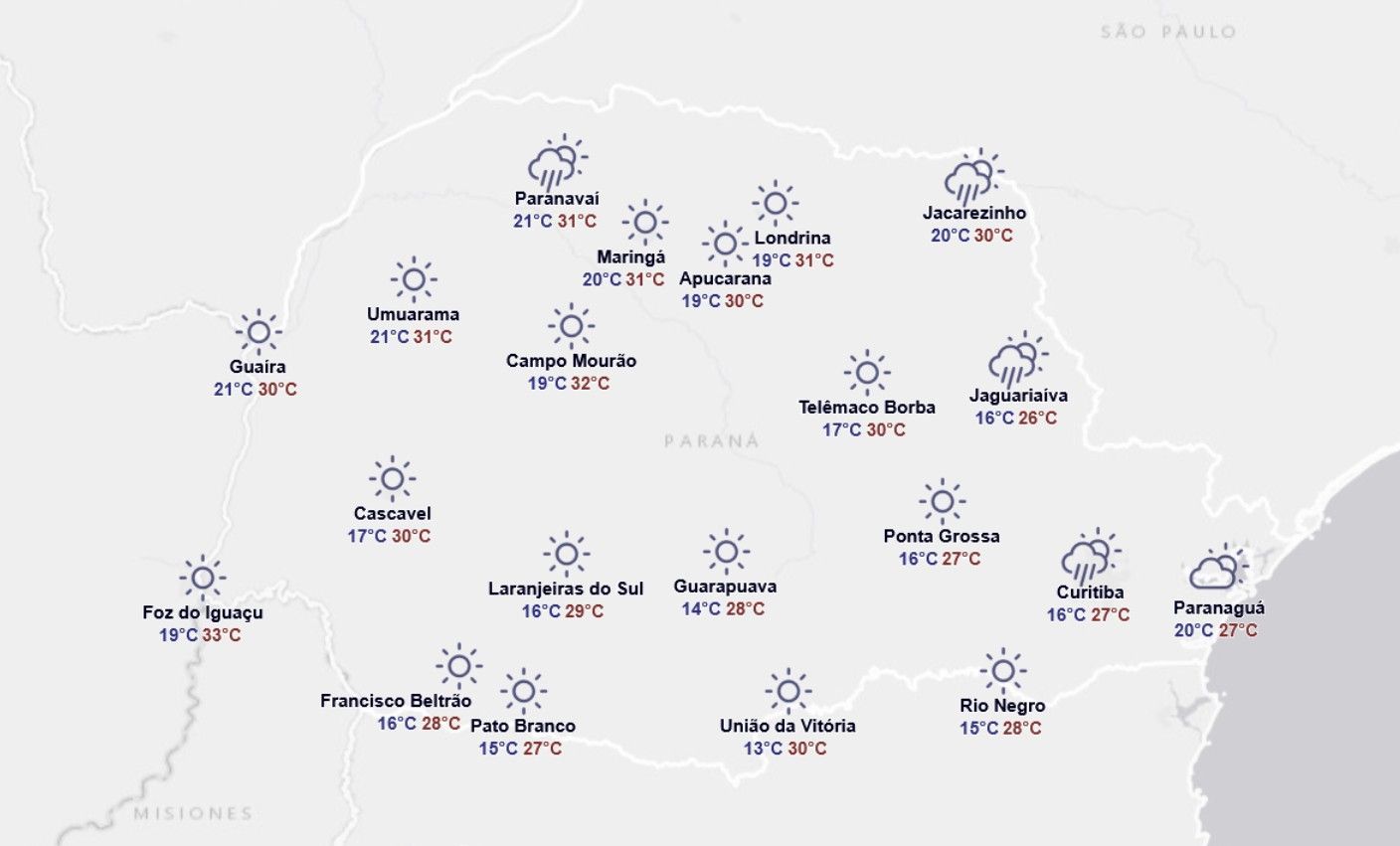 Na quinta e sexta (04 e 05), com um pouco mais de nuvens na região Leste em virtude do ingresso de umidade do oceano, serão registradas temperaturas mais baixas no amanhecer, na faixa de 14°C a 15°C no Centro-Sul, Campos Gerais e RMC.