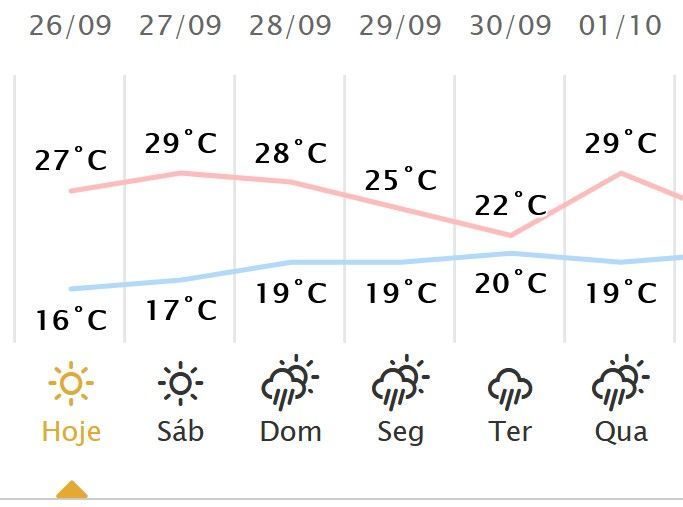 Em Toledo, a variação térmica é de 13°C a 25°C, com ventos de até 22 km/h e umidade entre 44% e 76%.