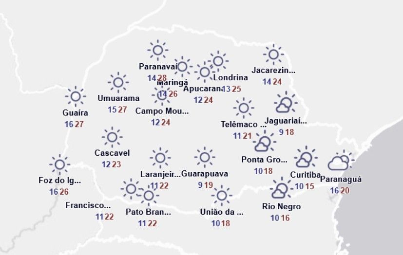 No interior do estado, o destaque é a amplitude térmica. Cidades como Guarapuava e General Carneiro registraram 10°C ao amanhecer, mas no decorrer do dia as temperaturas sobem rapidamente.