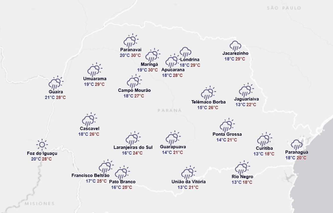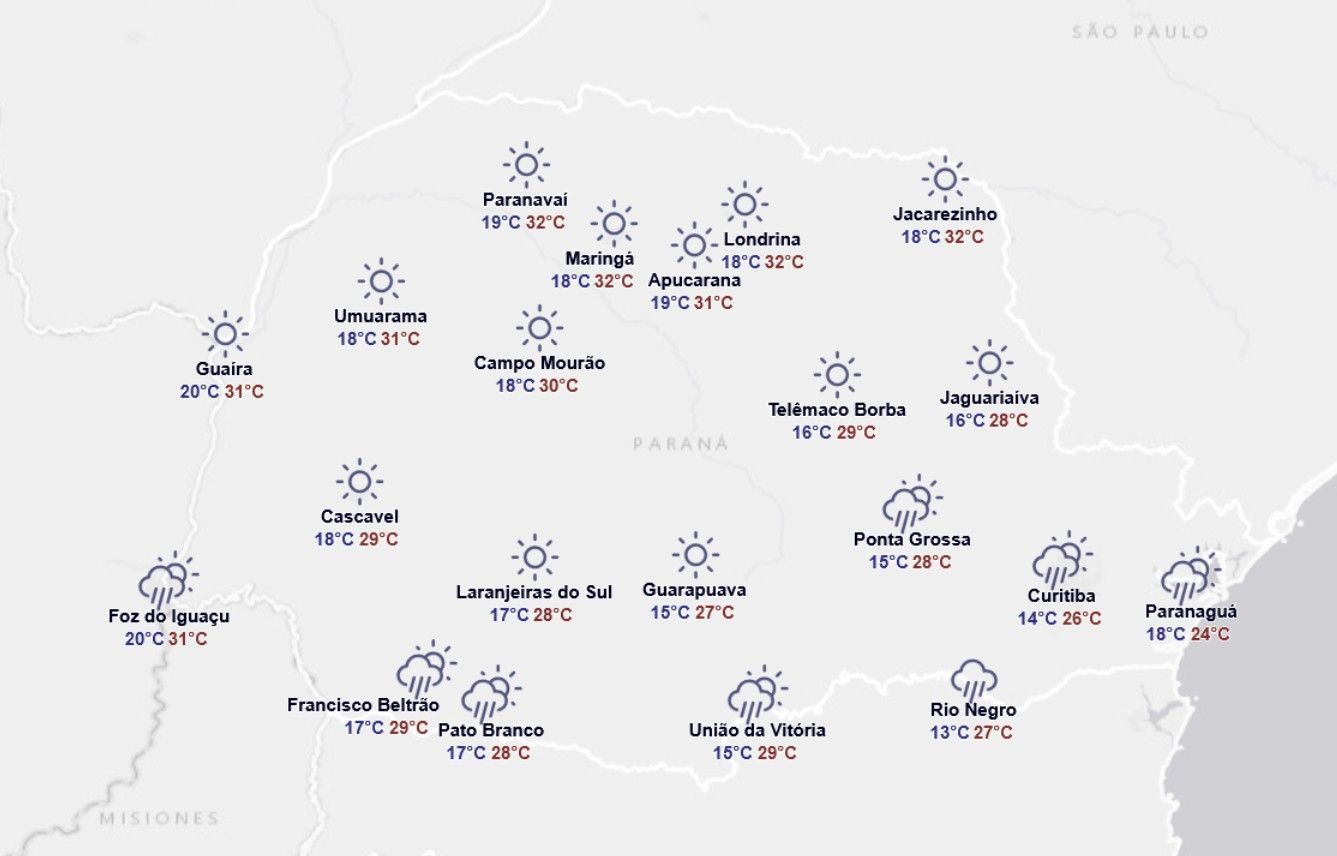 Apenas a região Norte está sem previsão de chuva neste sábado e por conta disso, as temperaturas chegarão aos 33°C na região de Loanda, e 31°C na região de Paranavaí. Entre Londrina, Maringá e o Norte Pioneiro, as temperaturas chegam aos 30°C novamente.