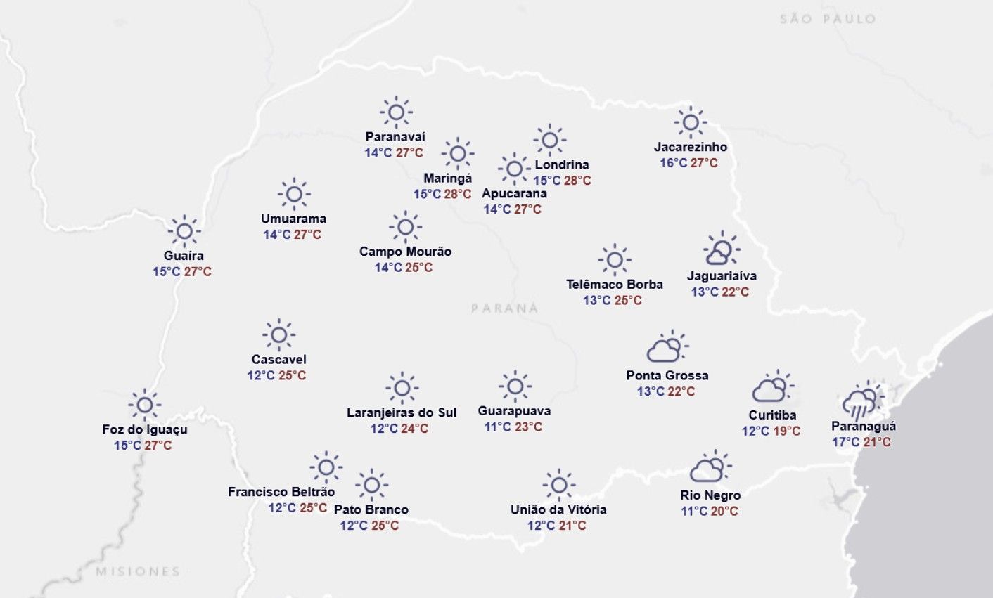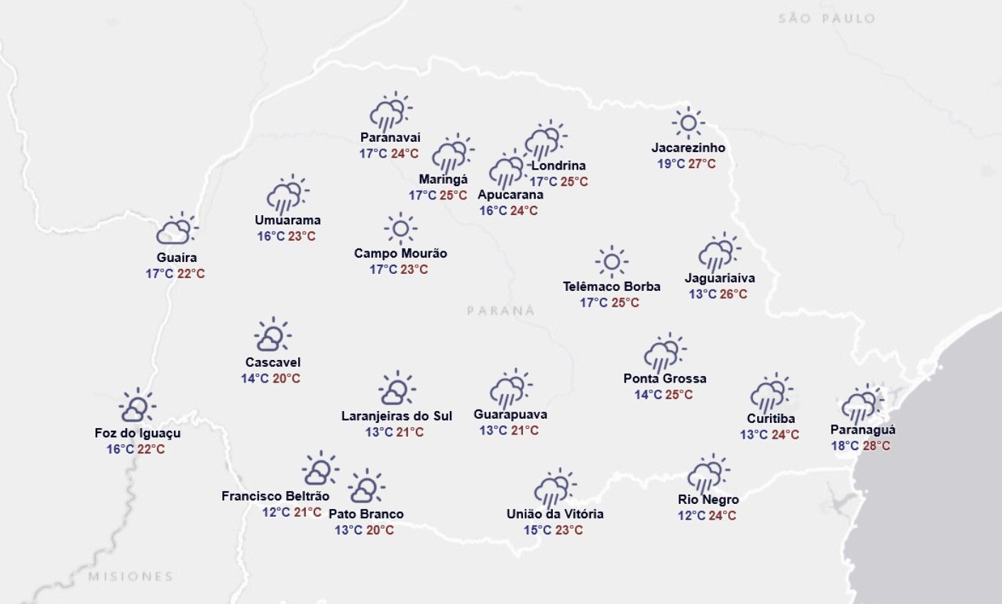 Veja, abaixo, a previsão do tempo para o Paraná divulgada pelo Simepar.