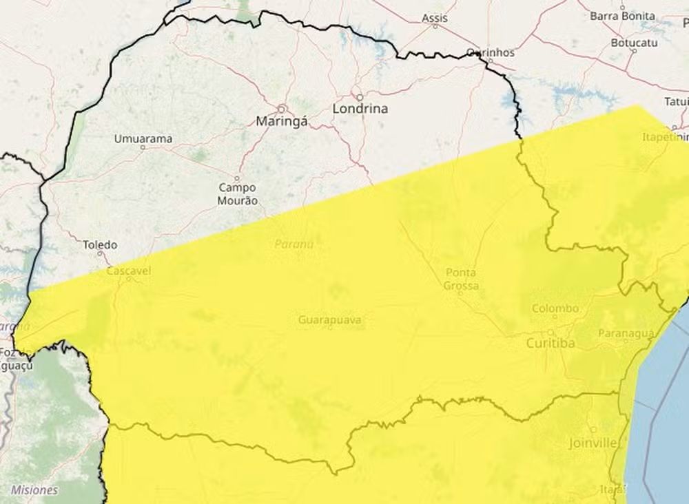 O mais amplo, que abrange todo o território paranaense, indica a possibilidade de chuva entre 20 e 30 milímetros por hora ou até 50 milímetros por dia, com ventos intensos, entre 40 e 60 km/h, e queda de granizos na sexta-feira (9). Há risco baixo para corte de energia elétrica, estragos em plantações, queda de galhos de árvores e de alagamentos.