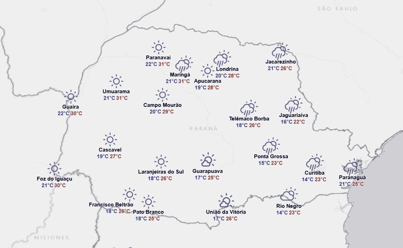 No Oeste o calor ainda é marcante. As temperaturas máximas permanecem acima dos 30°C, e em cidades como Terra Roxa, Palotina e Ivaté os valores nos termômetros podem se aproximar dos 35°C.