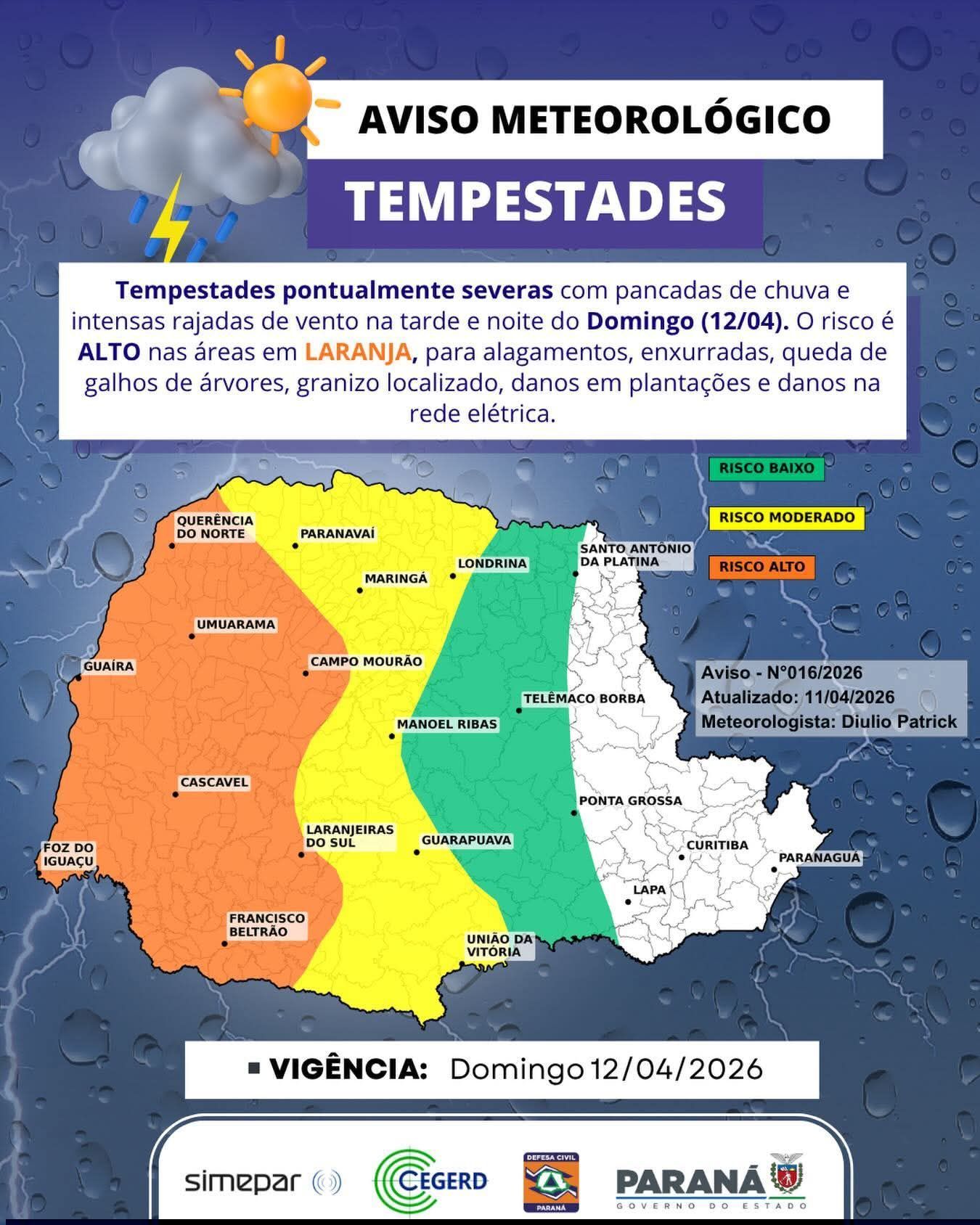Atualização do aviso meteorológico de tempestades para esse domingo no Paraná
