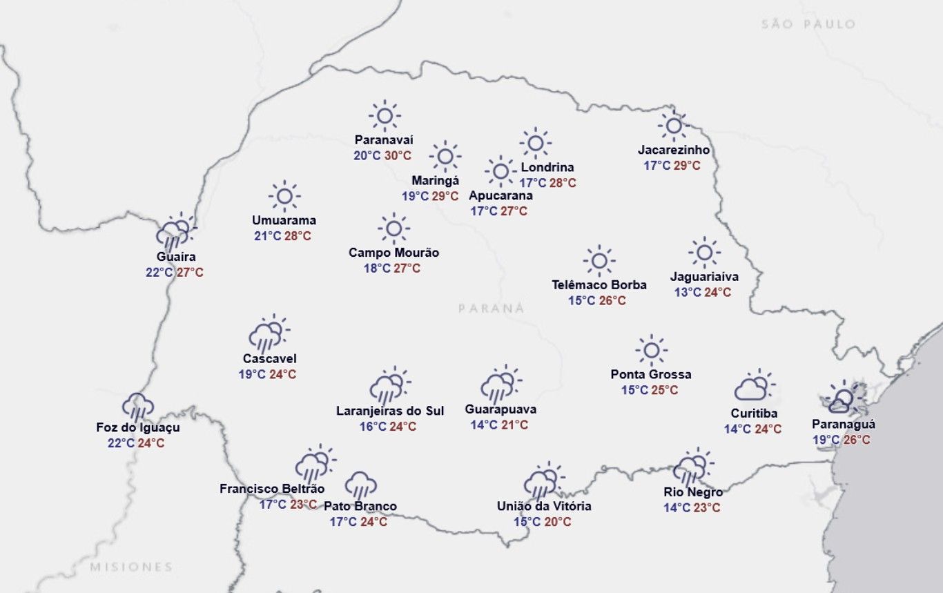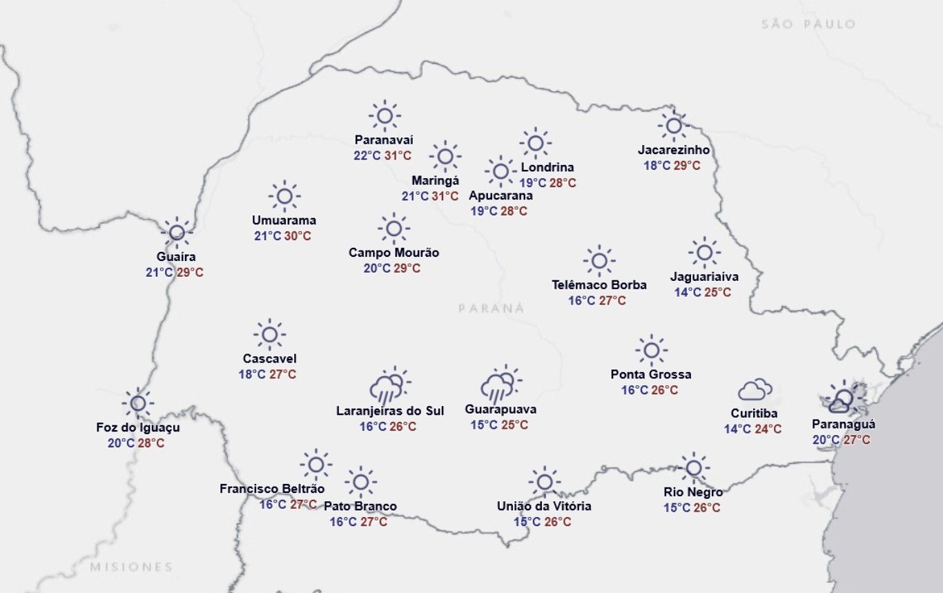 As temperaturas máximas permanecem mais elevadas nas faixas norte e oeste, com valores em torno dos 30 °C, ultrapassando esta marca no Noroeste.