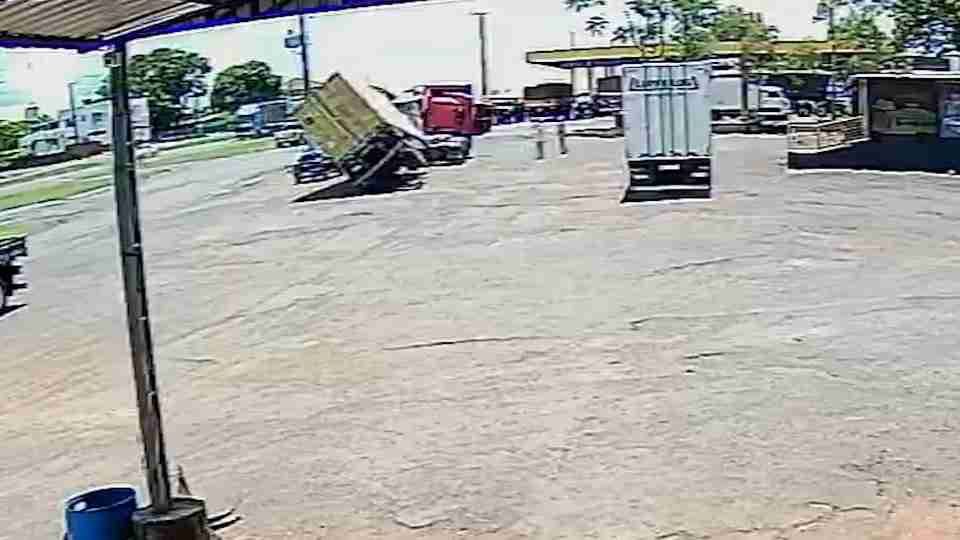 Após o primeiro acidente, um guincho levou o caminhão até o pátio de um posto de combustíveis em Santa Tereza. Durante a descarga, o contêiner se soltou e tombou.