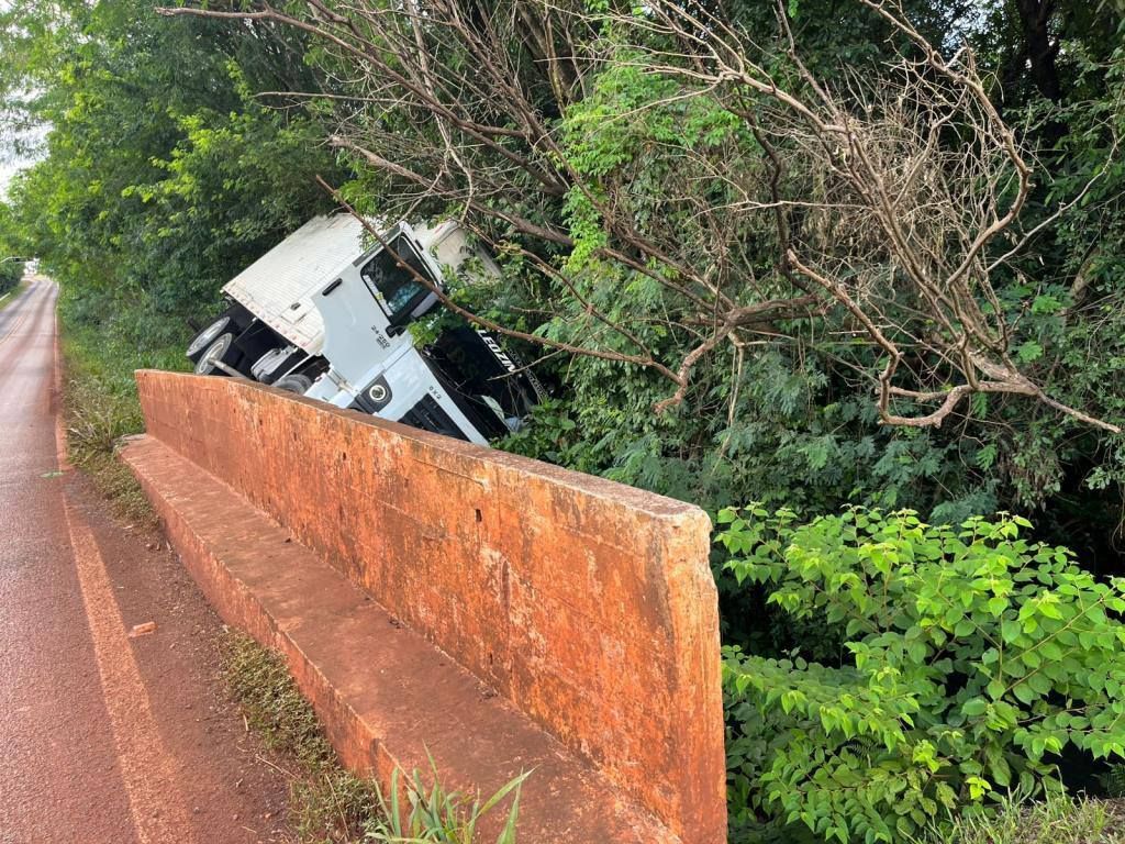 Na tarde de quinta-feira (29), um caminhão baú com placas de Pérola, região de Umuarama, saiu da pista e caiu às margens da rodovia PR-491, em Nova Santa Rosa, nas proximidades da ponte do Rio Sanga Xerê, no trecho com sentido a Maripá.