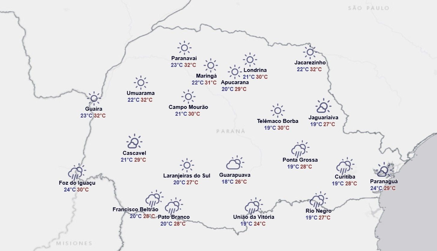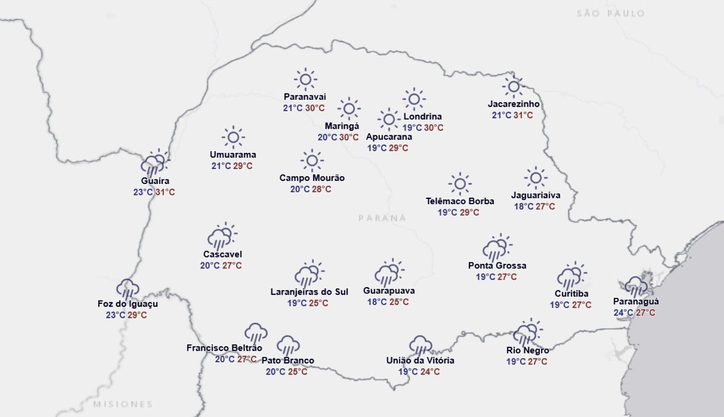 No domingo (15), as temperaturas seguem elevadas em todo o Paraná, com máximas próximas dos 30 °C na maior parte das regiões e podendo se aproximar dos 35 °C na faixa norte, onde o sol predomina e a chance de chuva é baixa. Por outro lado, as instabilidades ficam mais concentradas na metade sul do estado. Nesta faixa, o tempo permanece mais instável, com possibilidade de chuva a qualquer momento e formação de tempestades isoladas, especialmente durante a tarde.