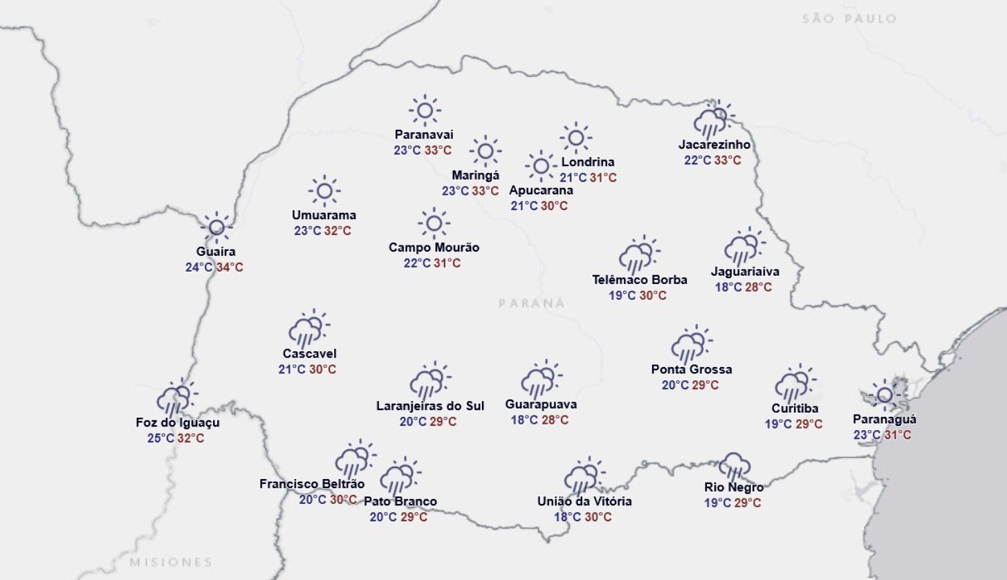 Conforme informa o Sistema de Tecnologia e Monitoramento Ambiental do Paraná (Simepar), "no sábado (14), o tempo segue instável em todo o Paraná. Especialmente a partir da tarde, há possibilidade de tempestades isoladas e distribuídas de maneira irregular por todas as regiões paranaenses.