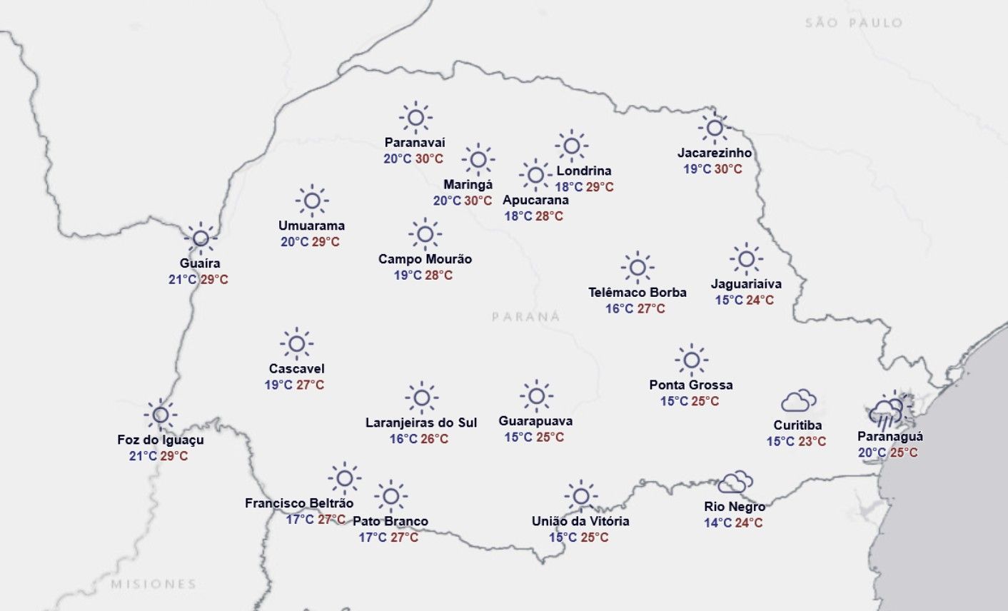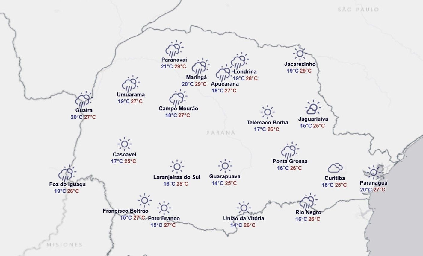 terça-feira (14), o tempo estável volta predominar em praticamente todas as regiões paranaenses, onde o Sol aparece com variação de nuvens. A exceção se dá no Leste, onde a circulação marítima é reforçada, com aumento das nuvens, temperaturas mais amenas e chuviscos, especialmente na Serra do Mar e nas praias, e também no extremo Oeste, com chuvas passageiras e irregulares ao final do dia.