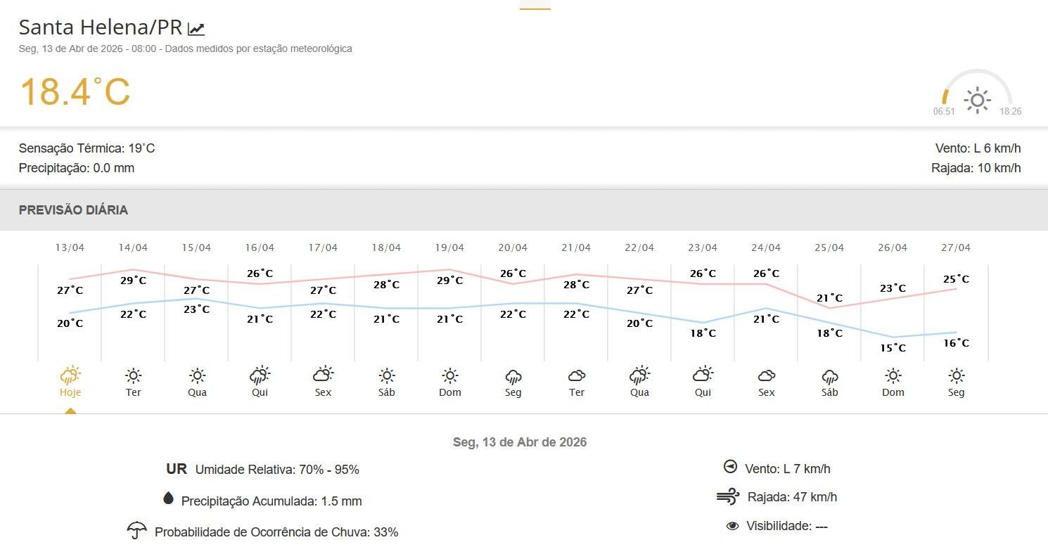 Em Santa Helena, o dia começou com 17° C de temperatura, devendo atingir os 27° C ao longo do período.