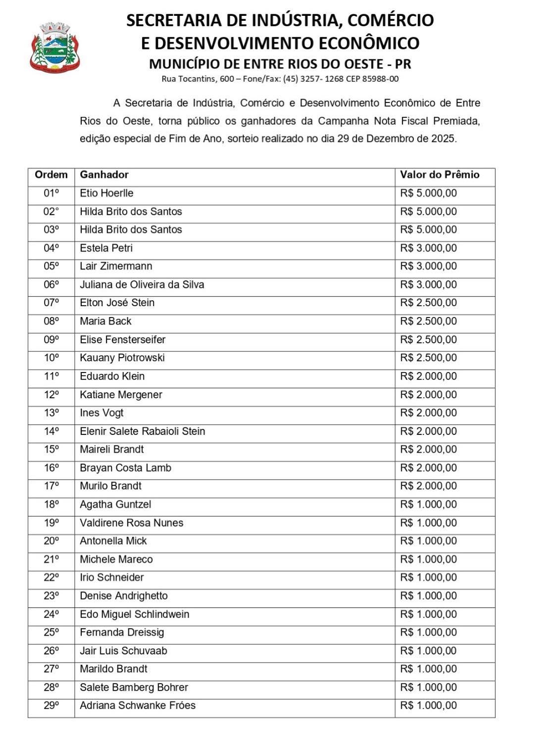 Todos(as) os(as) munícipes que contaram com a sorte neste sorteio, os parabéns da municipalidade, e que em 2026, você que ainda não ganhou na Campanha do Comércio de Entre Rios do Oeste, seja sorteado(a).