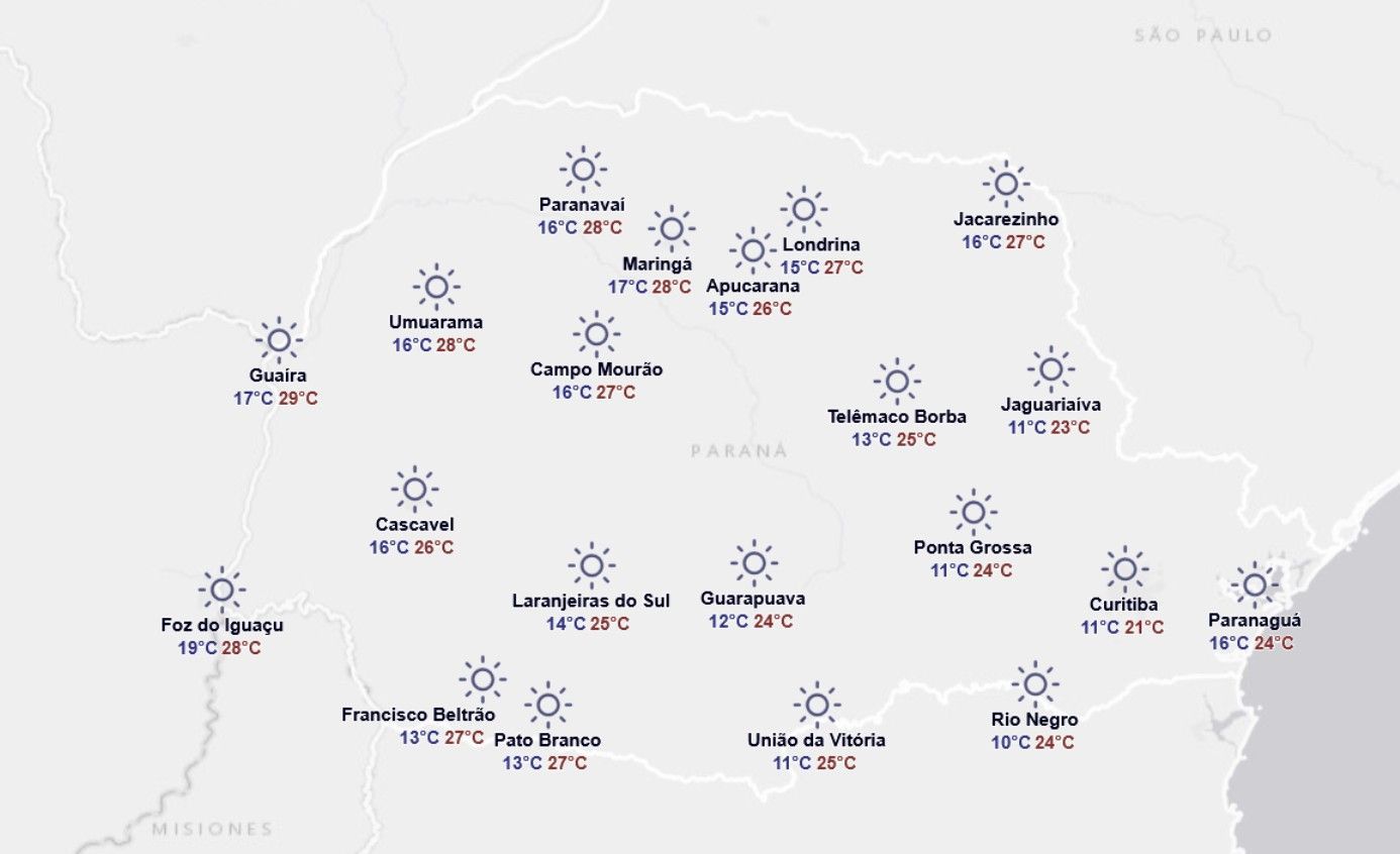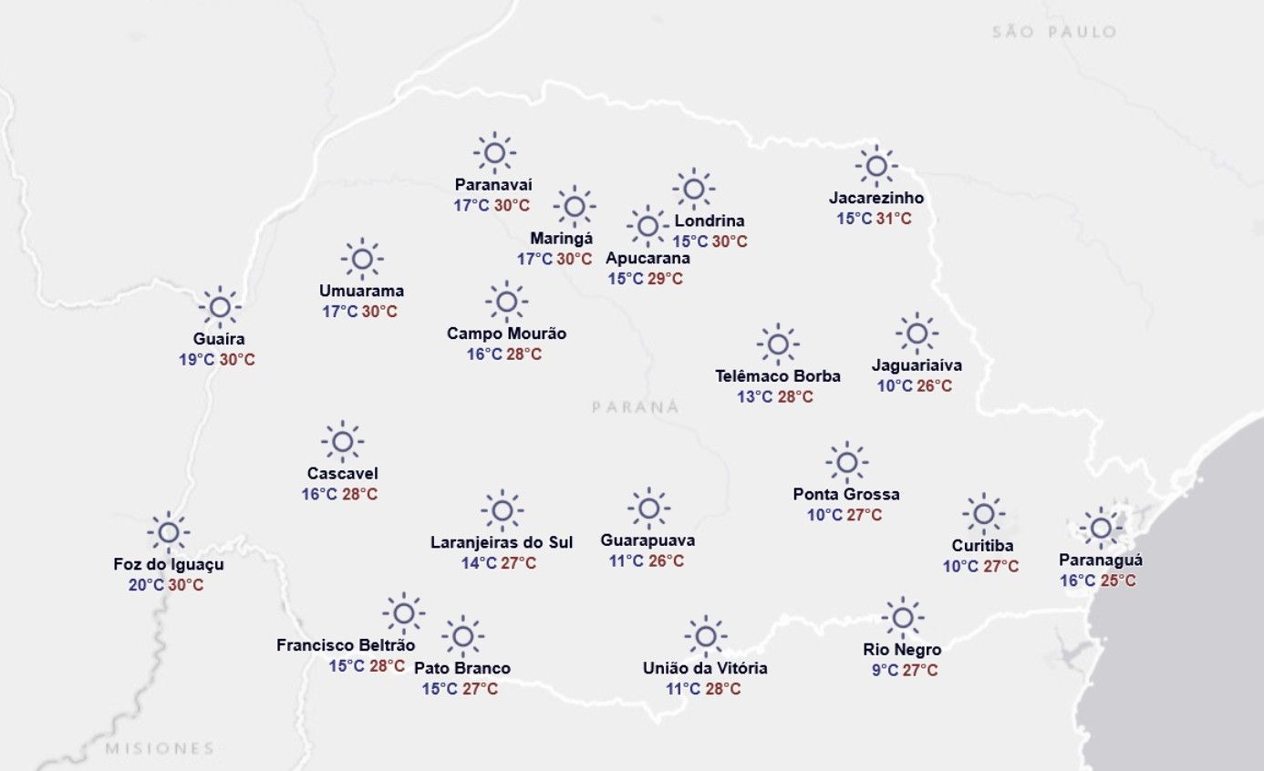 Veja, abaixo, a previsão do tempo para o Paraná divulgada pelo Simepar.