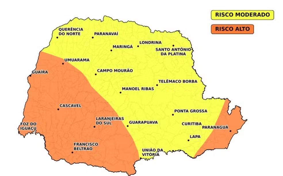 Tempestades pontualmente intensas poderão ocorrer entre o Centro-Sul, parte dos Campos Gerais, Região Metropolitana de Curitiba (RMC) e Litoral, onde o risco é alto para enxurradas, destelhamentos, queda de galhos de árvores e danos na rede elétrica, aponta boletim meteorológico.