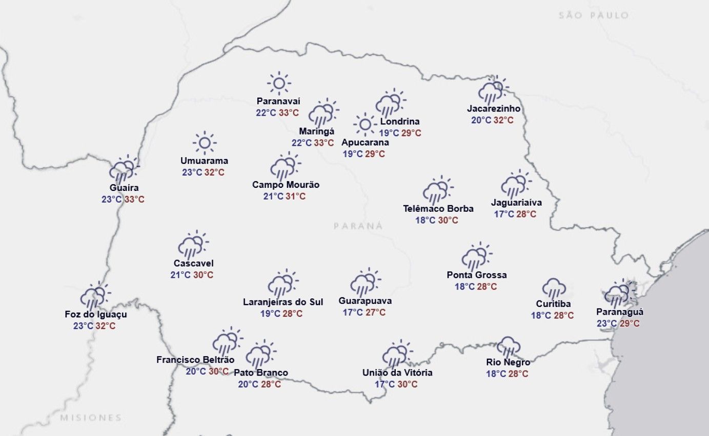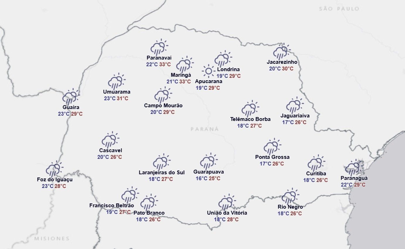 "As temperaturas já não se elevam tanto em virtude da maior presença de instabilidades, com as máximas entre 25°C e 28° do Centro ao Leste e no Sul do Paraná, e podendo ainda ultrapassar os 30°C nas faixas oeste e norte".