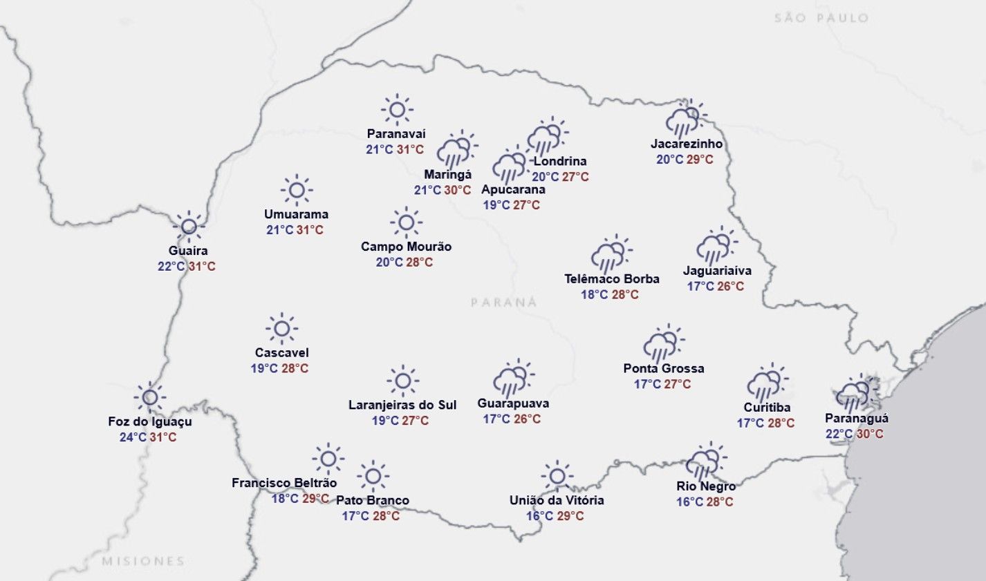 Segundo o Sistema de Tecnologia e Monitoramento Ambiental do Paraná (Simepar) a manhã começou com nebulosidade variável sobre o Paraná. As nuvens se apresentam de forma mais persistente na faixa leste do estado, devido à maior influência da umidade oceânica, enquanto no interior há maior abertura de sol.