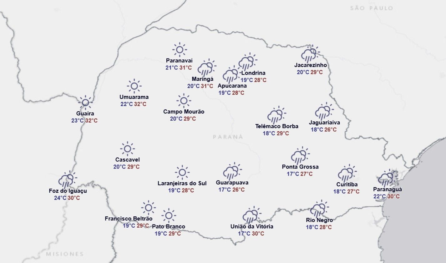 No domingo (18), a frente fria avança e mantém o tempo instável no Paraná. As temperaturas apresentam breve declínio, porém as máximas ainda permanecem acima dos 25 ºC.