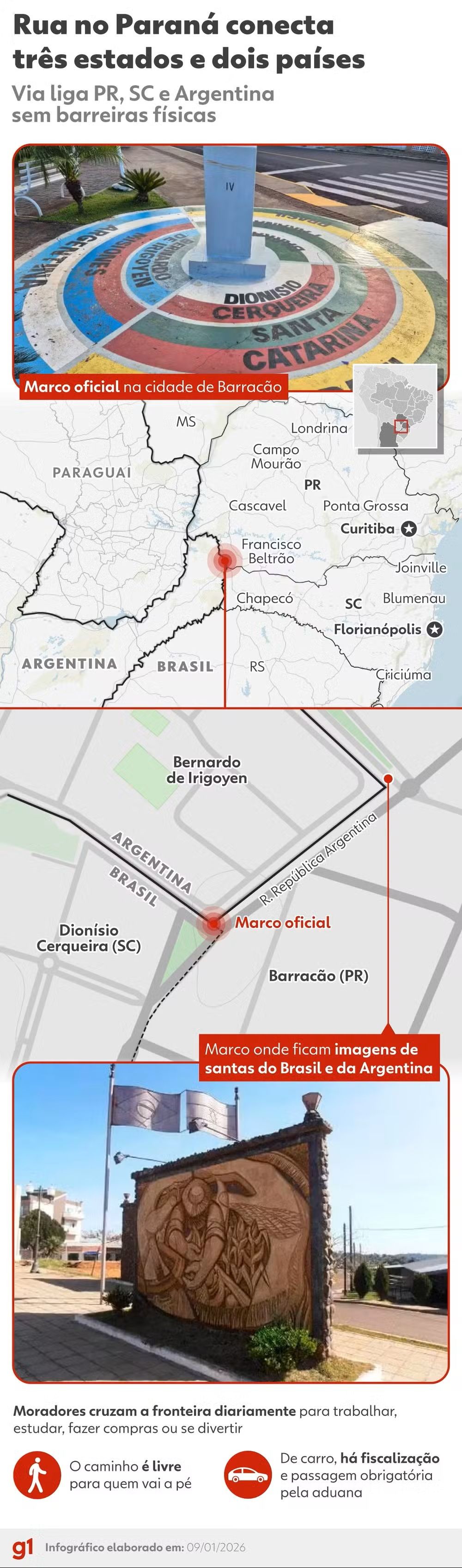 Infográfico - Rua no Paraná liga três cidades, três estados e dois países em poucos passos — Foto: Arte/g1
