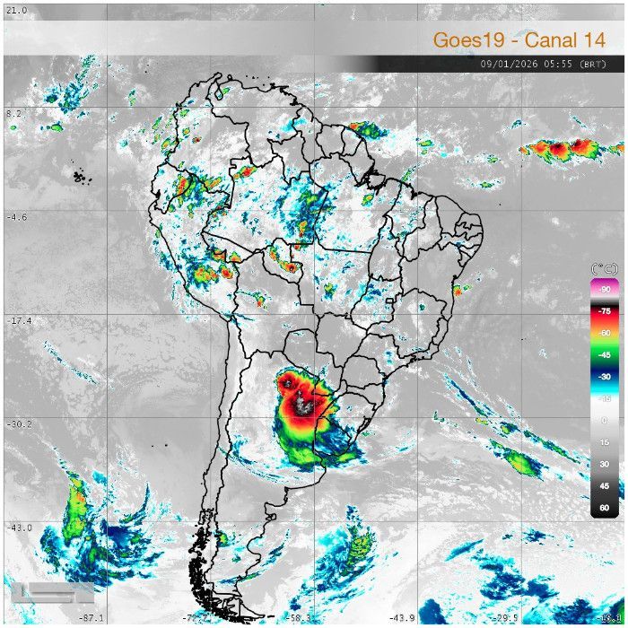 Entre esta sexta-feira e o domingo um sistema de baixa pressão avança do norte da Argentina em direção ao Uruguai e o Rio Grande do Sul, dando origem a um ciclone extratropical. A área com pressão mais baixa está prevista para atingir o Uruguai e o sul do Rio Grande do Sul.