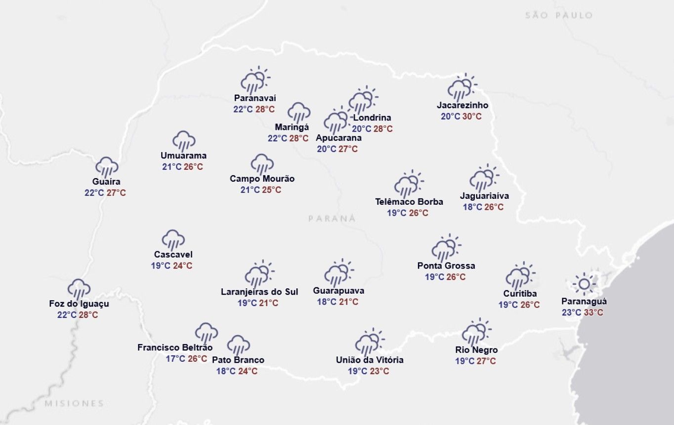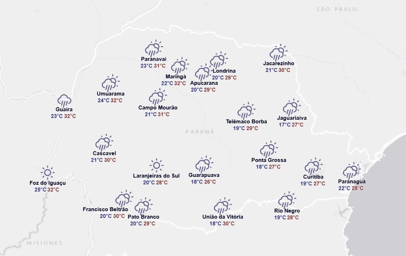 Há previsão de temporais sobre o estado, com chuva e vento forte, muitos raios e até granizo. No Oeste, Sudoeste e Sul estes eventos ocorrem já pela manhã. Aquece mais do Norte ao Leste paranaense.
