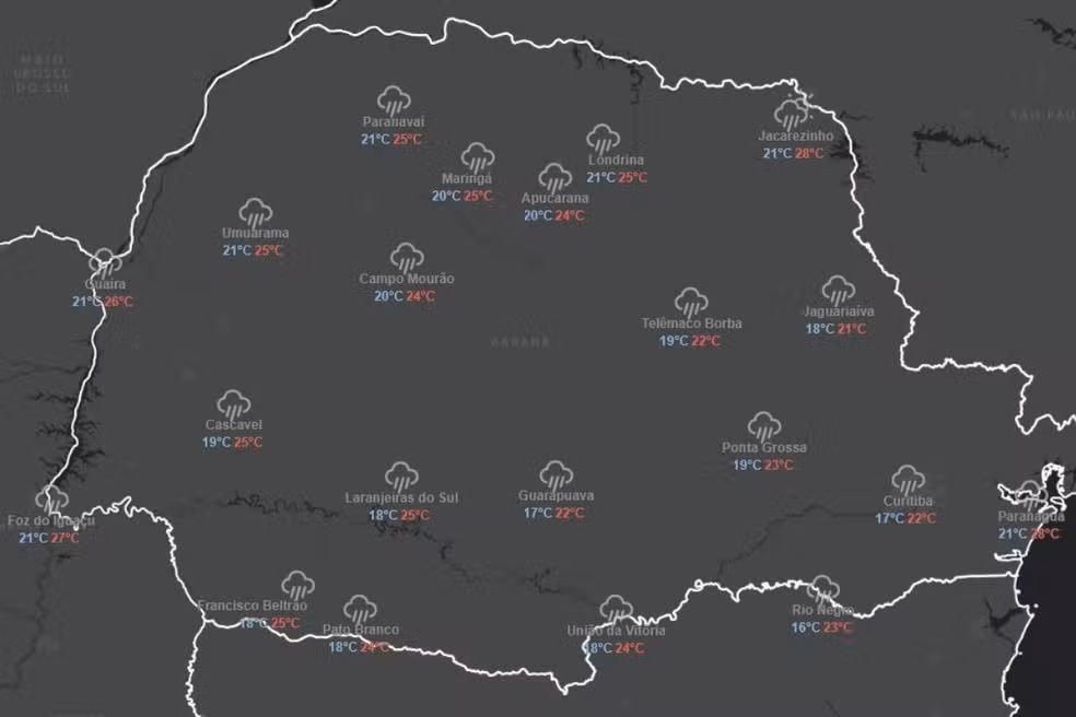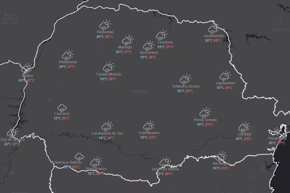 Veja, abaixo, a previsão do tempo para o Paraná divulgada pelo Simepar.