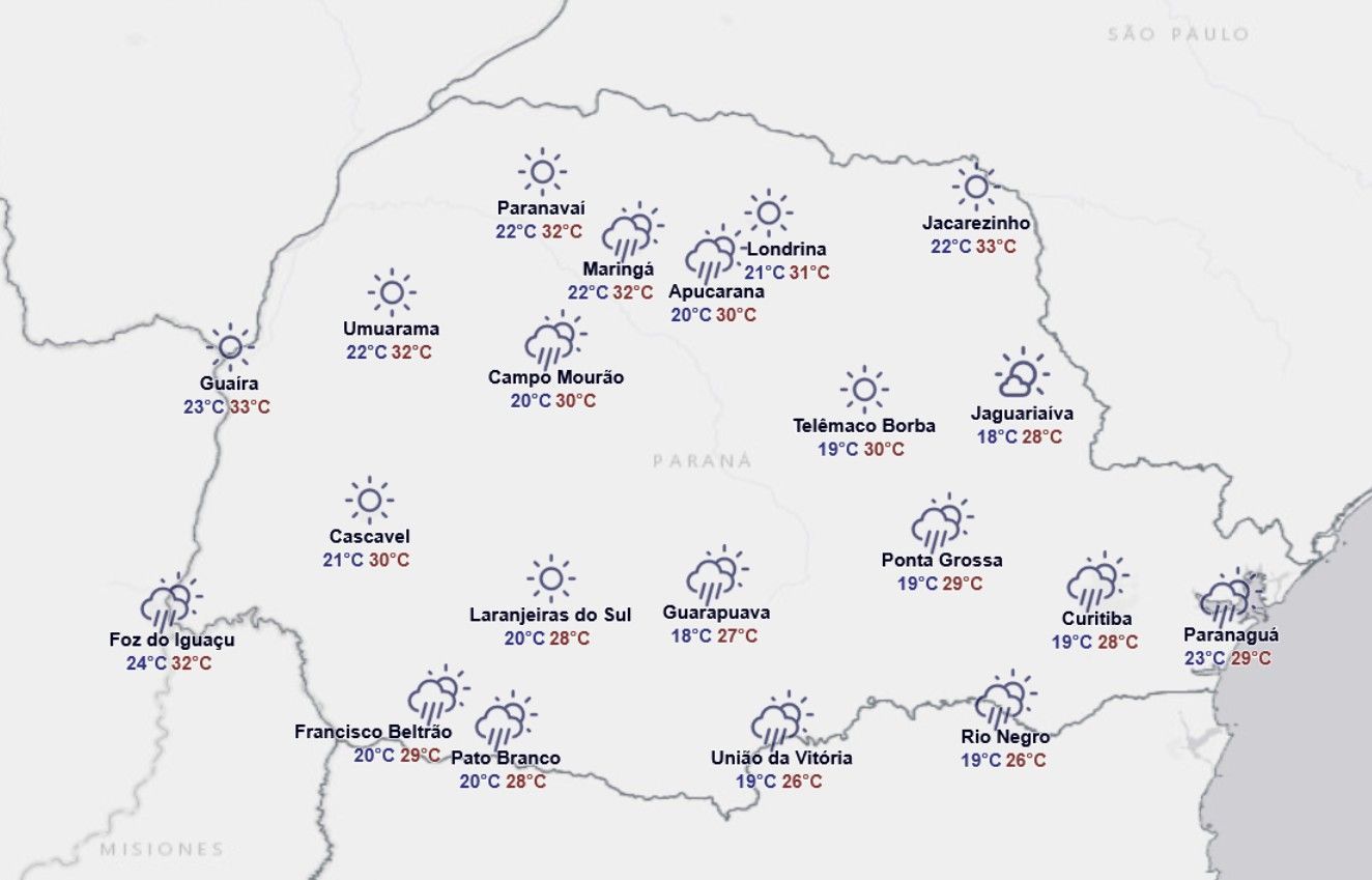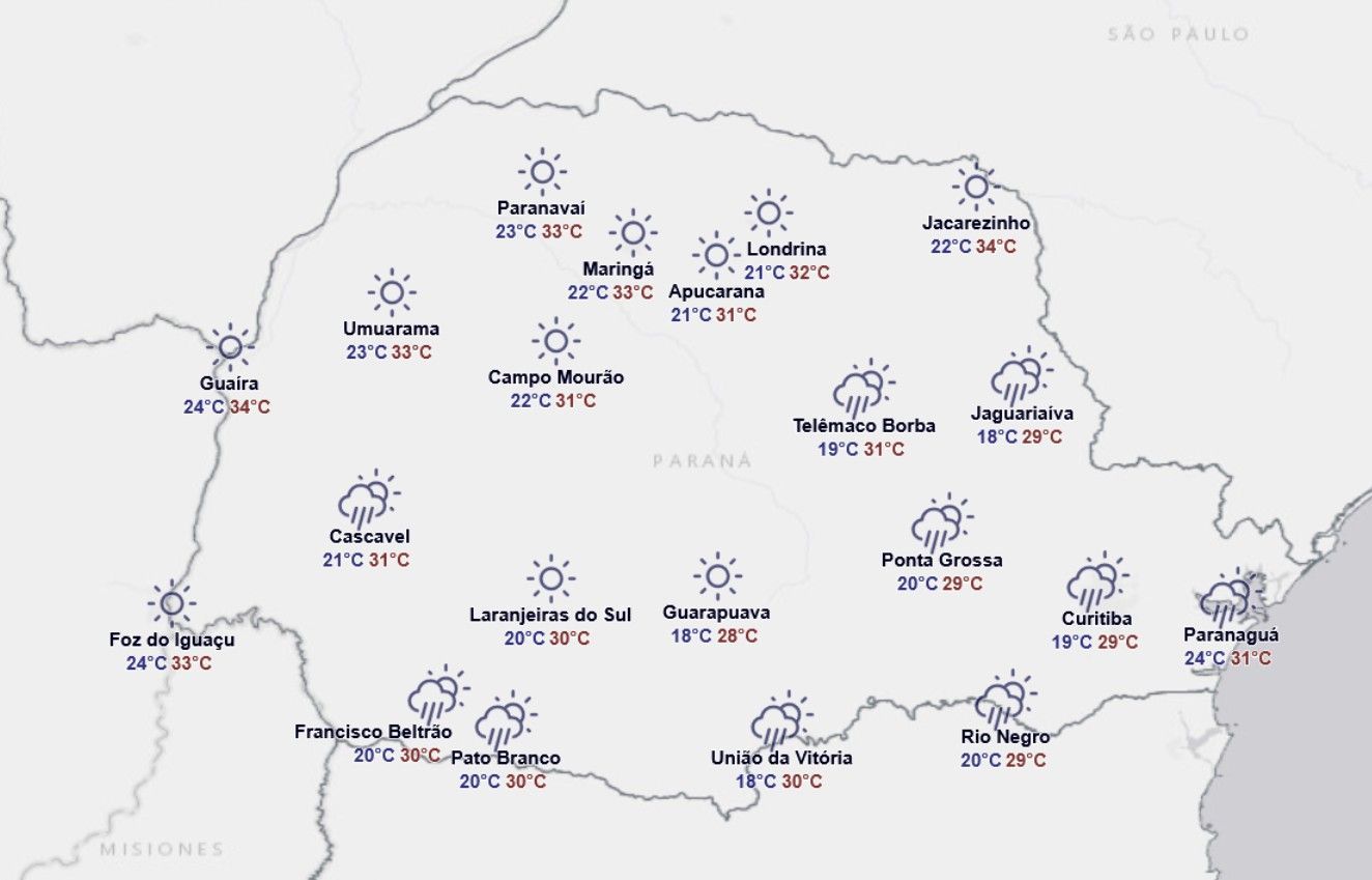 Conforme informa o Simepar, no domingo (15), as temperaturas seguem elevadas em todo o Paraná, com máximas próximas dos 30 °C na maior parte das regiões e podendo se aproximar dos 35 °C na faixa norte, onde o sol predomina e a chance de chuva é baixa.