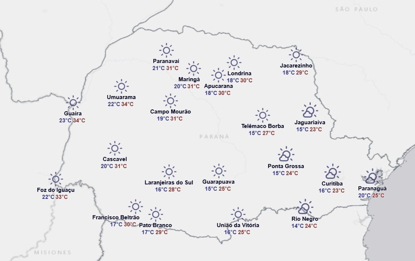 TEMPERATURAS – Com exceção da RMC e do Litoral, as temperaturas estão subindo gradativamente em todo o Paraná pois, a cada dia, há maior predomínio de sol no estado.